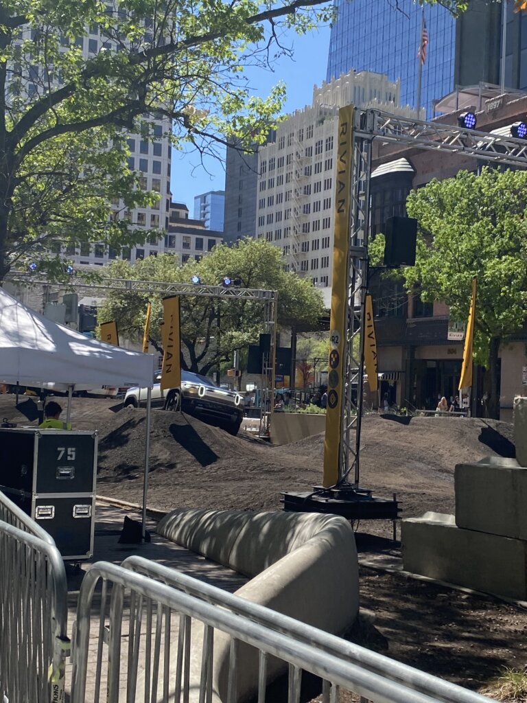 It’s hard to ignore 2,500 pounds of recycled asphalt mounded into a 245-foot-long off-road test course in the middle of Congress Avenue. Rivian’s Joyride was designed to demonstrate the agility of its new R2, a smaller version of its original vehicle. With a quick waiver, any passerby could join one of the brand’s 27 professional drivers to experience the steep hills and dramatic tilts, often with only two wheels on the ground.
