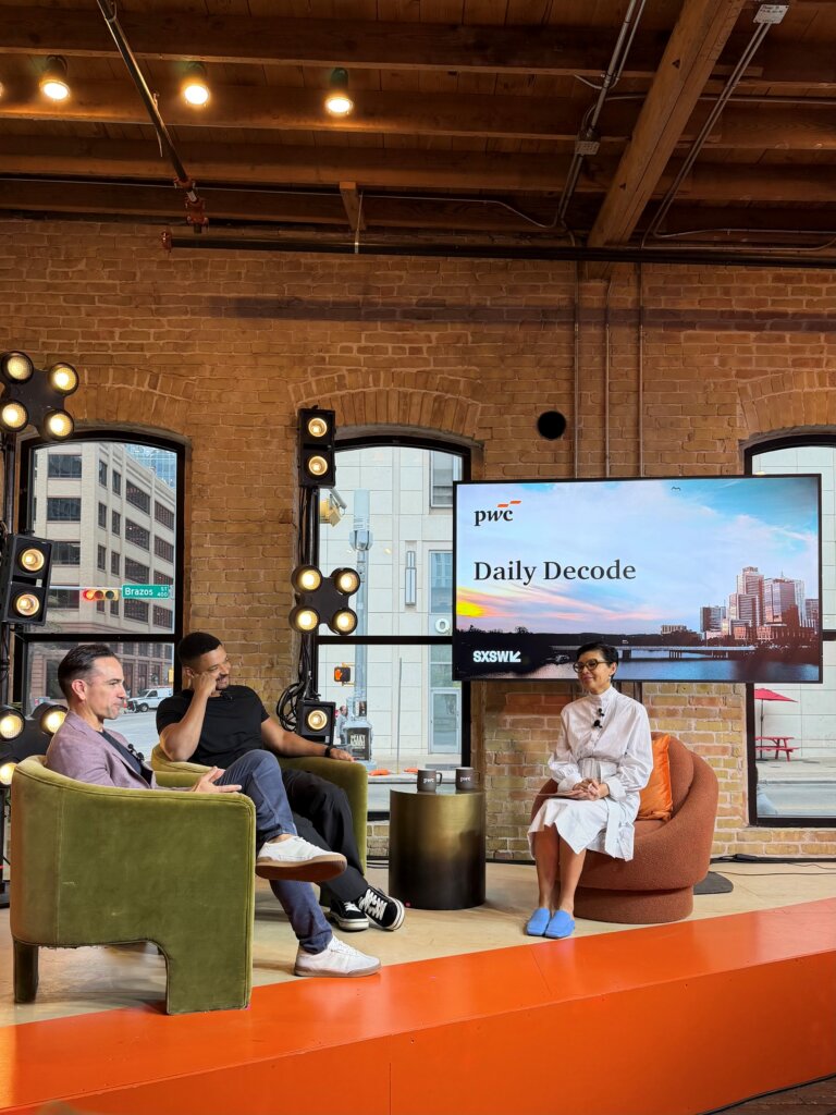 Within the SXSW Innovation Clubhouse, PwC leveraged the topic on everyone’s minds: AI. Each day, they cycled through questions to understand the perspective of SXSWers with inquiries about technology and its evolving role in society. Questions included, “Who has the most influence on culture right now?” and “Should creative works made without AI carry a ‘human-made’ label?” Participants answered a new single question each day in exchange for a shot at a prize-filled claw machine. The results populated a 3D screen display in a lounge setting complete with couches and chairs to bring the Decode Zone to life.